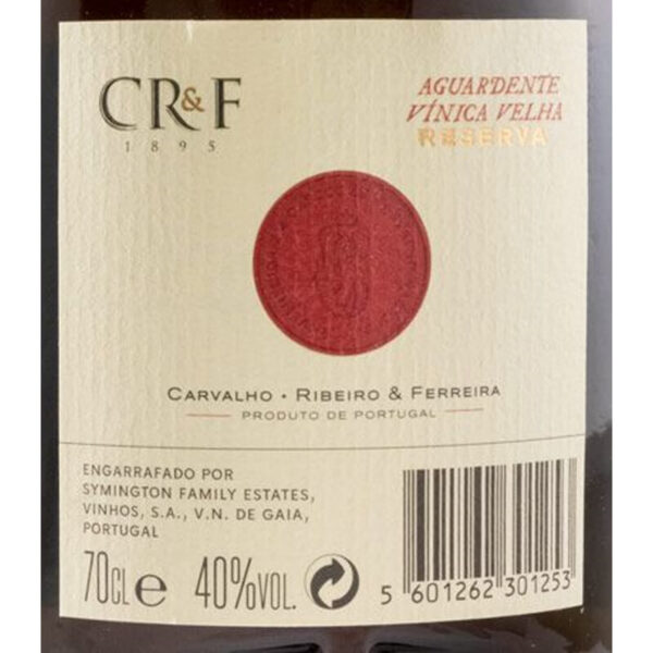 CRF é uma excelente aguardente líder entre as melhores aguardentes portuguesas. Esta aguardente é elaborada a partir da mesma receita desde que foi produzida pela primeira vez, em 1895. É uma aguardente envelhecida em barricas de carvalho, que lhe dão uma cor escura topázio com um aroma intenso e complexo. Final muito longo e persistente.